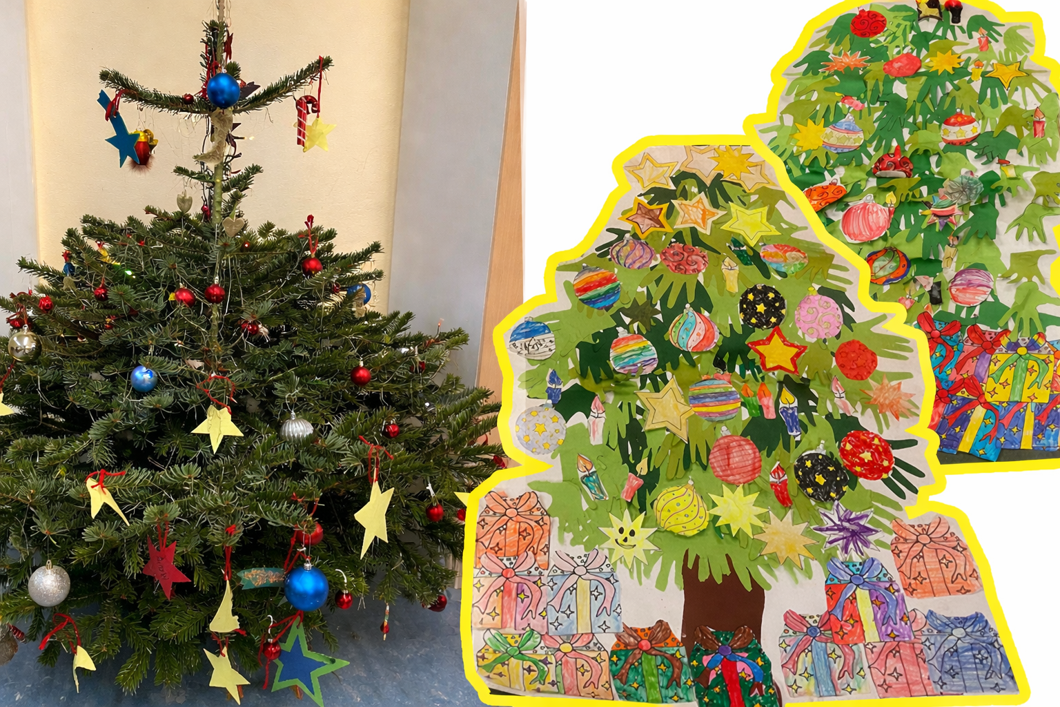 Den Klassenraum der Klasse 3b ziert die letzten Schultage bis zu den wohlverdienten Weihnachtsferien ein echter Weihnachtsbaum. Um die festliche Dekoration kümmerten sich kurzerhand die Schülerinnen und Schüler dieser Klasse. So brachten die Kinder eine Lichterkette, verschiedene Weihnachtsbaumkugeln und Baumanhänger mit in die Schule. Auch im Kunstunterricht der ersten Klassen wurde es weihnachtlich. Als Gemeinschaftsprojekt wurde ein Weihnachtsbaum gebastelt und dekoriert.